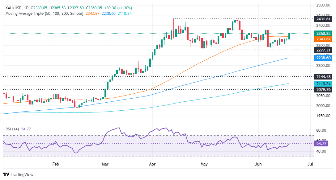 Gold buyers are testing the Head-and-Shoulders pattern, dragging the golden metal above the pattern’s neckline. A daily close above the latter's confluence and the 50-day Simple Moving Averages (SMA) at around $2,343 could negate the bearish chart pattern and open the door for further gains.