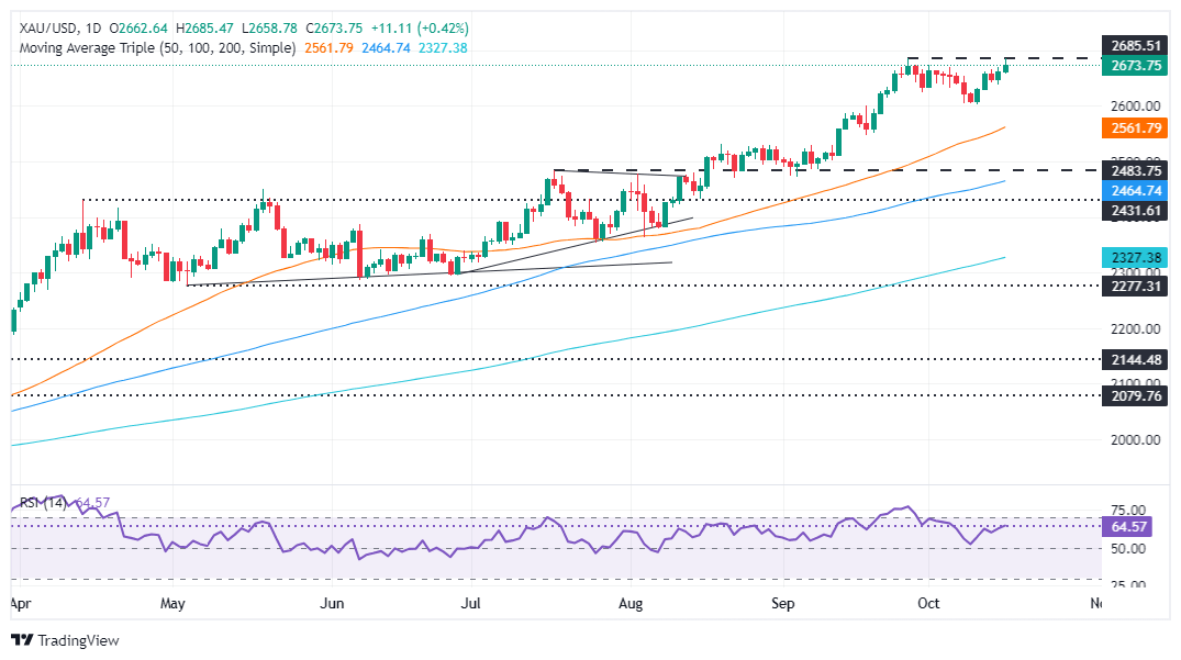 Conversely, if XAU/USD falls below the October 4 high at $2,670, a retracement toward $2,650 is on the cards. On further weakness, the next support would be $2,600, followed by the 50-day Simple Moving Average (SMA) at $2,561.
