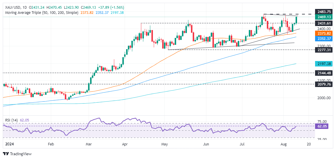 Conversely, if XAU/USD drops below $2,450, the next support would be $2,400, followed by the 50-day Simple Moving Average (SMA) at $2,373. Once surpassed, the decline could intensify, leading to the 100-day SMA at $2,352, followed by a support trendline around $2,320.