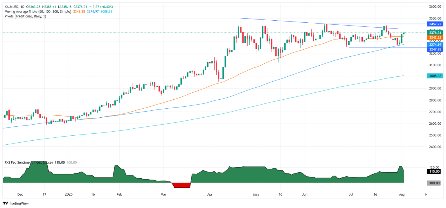 Gold price posted modest gains on Monday as expectations that the Federal Reserve (Fed) could cut interest rates rose since last Friday, following last Friday's dismal US Nonfarm Payrolls report. The XAU/USD trades at $3,375, edges up 0.39%.