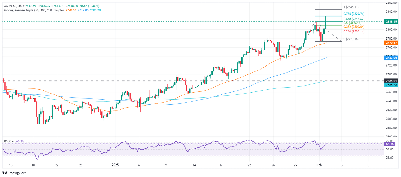 If XAU/USD rises past $2,830, the next resistance would be the 100% Fibonacci level near $2,844 as part of the January 25 to January 31 leg up, which can be seen in the 4-hour chart below. If surpassed, the next resistance will be the 161.8% Fib extension at $2,889, ahead of $2,900.