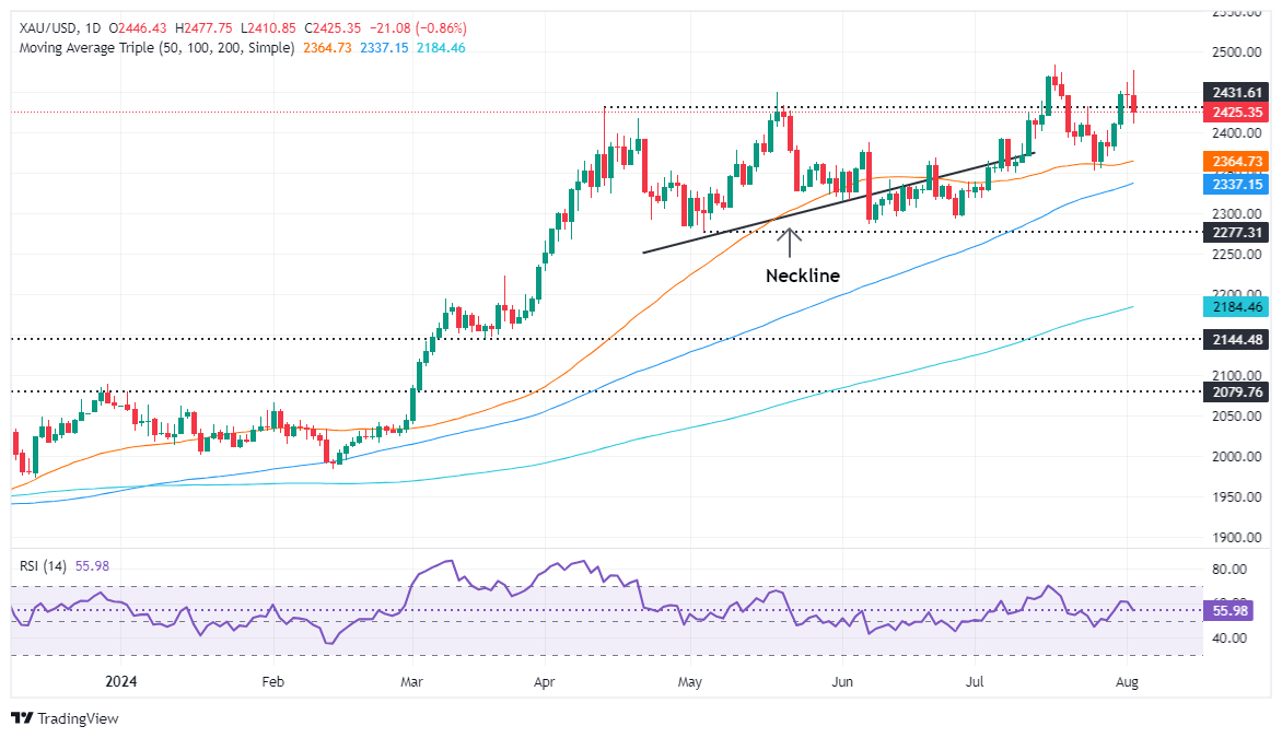 Gold price has retreated toward the July 31 lows of $2,404-$2,410, which could be attributed to profit-taking ahead of the weekend, as US yields and the Greenback remain at weekly lows. From a technical standpoint, XAU/USD is set to remain bullish and if buyers achieve a daily close above $2,450, this could exacerbate a challenge towards the all-time high, ahead of the $2,500 mark. On further weakness, prices could fall below $2,400, which could pave the way for a pullback to the 50-day moving average (DMA) at $2,364, before testing the 100-DMA at $2,337.