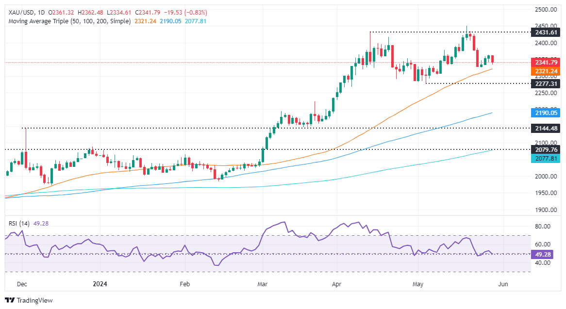 That said, the XAU/USD's first support would be the 50-day Simple Moving Average (SMA) at $2,321. A breach of the latter will expose the May 8 low of $2,303, followed by the May 3 cycle low of $2,277.