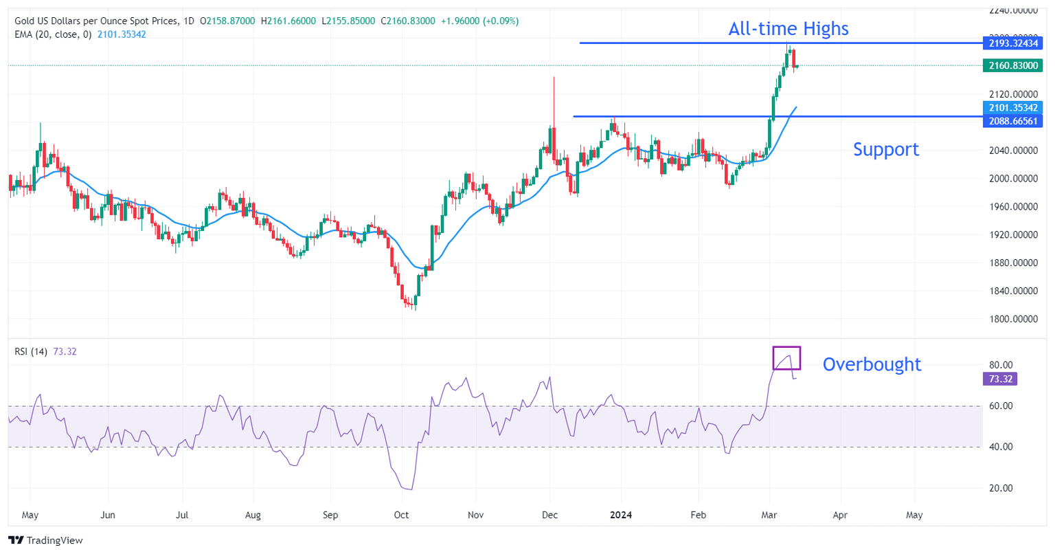 - Gold price finds temporary support near $2,160 after a sharp decline from all-time highs at $2,195. The surprisingly stubborn United States inflation data for February has cast doubts over expectations for the Federal Reserve reducing interest rates in the June policy meeting.