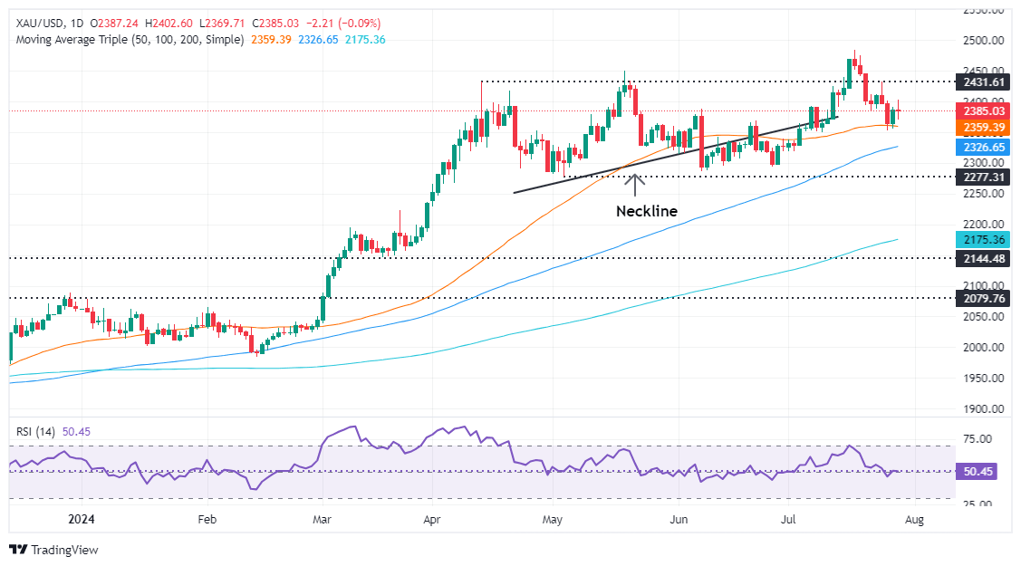 If XAU/USD buyers reclaim $2,400, that could push prices above the psychological $2,450 area. A breach of the latter will expose the all-time high (ATH) at around $2,483, followed by the $2,500 mark.