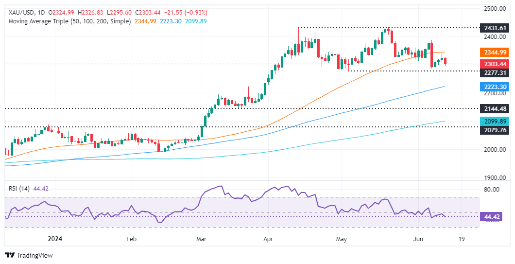 The Gold price remains neutral to downwardly biased as the Head-and-Shoulders chart pattern remains in place, hinting that the non-yielding metal price is set for further losses. Momentum as measured by the Relative Strength Index (RSI) shows that sellers are in charge, an indication that once XAU/USD’s price drops below $2,300, lower prices lie ahead.