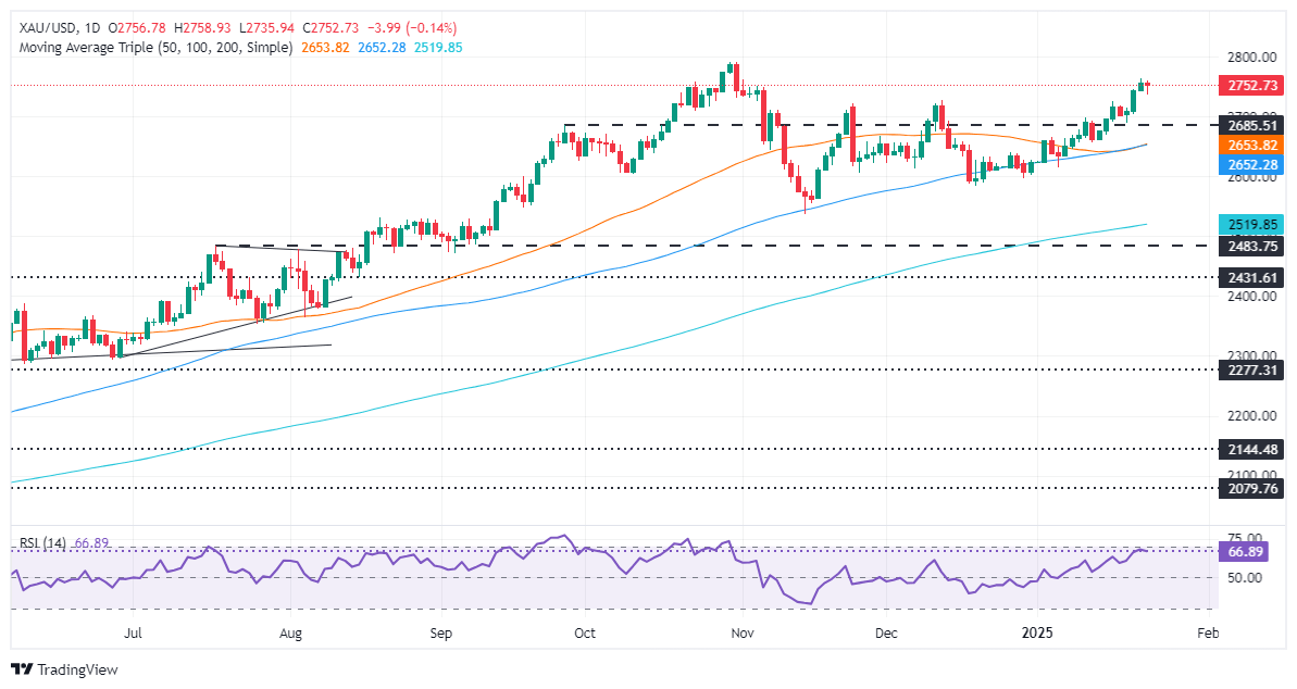 Despite this, a strong uptick on inflation could spark a buying frenzy into the non-yielding metal, pushing prices higher. In that outcome, if XAU/USD surpasses the all-time high (ATH) at $2,790, up next is the $2,800 mark. Once surpassed, key psychological levels would be exposed at $2,850 and $2,900.