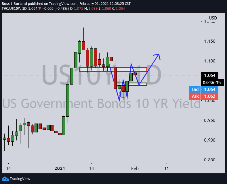 US 10-year yields are indeed lower today, travelling from a high of 1.089% to a low of 1.060% and down some 0.48% at the time of writing.