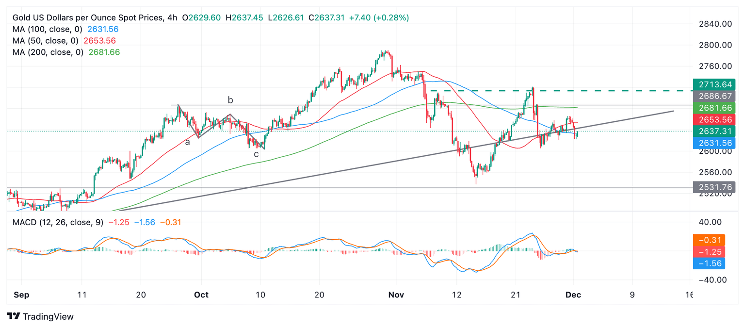 Within this sideways market, the chart looks poised to go lower. The fall from the November 25 high looks incomplete, and despite support from the trendline, more downside seems likely. A break below $2,605 (November 26 low) would confirm a follow-through lower towards the range lows in the $2,530s.
