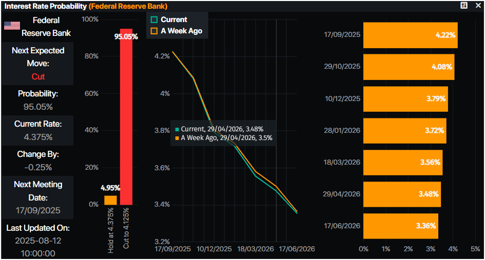 - Traders have priced in a 95% chance of a 25 bps rate cut at the September meeting, according to Prime Market Terminal data.