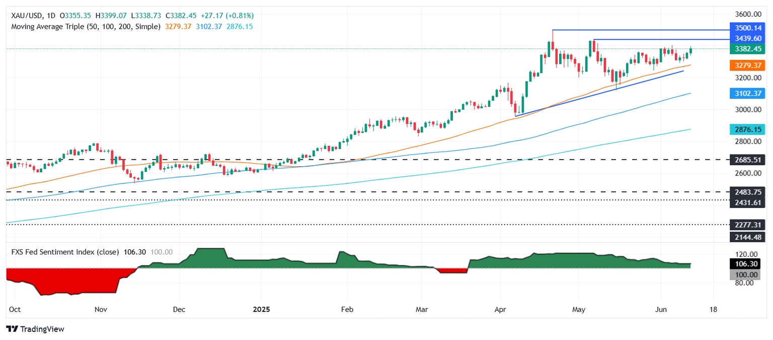 Gold price rallies for the second straight day, shy of testing the $3,400 figure following the release of softer inflation and jobs data in the United States (US) as geopolitical tensions grow in the Middle East. The XAU/USD trades at $3,386 at the time of writing.