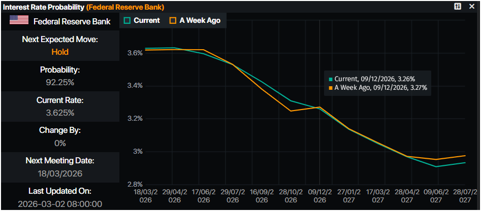 Speculation that the Federal Reserve (Fed) policy will ease is a tailwind for Gold price. Money market players are pricing in 49 basis points of easing, down from 61 basis points, according to Prime Market Terminal.