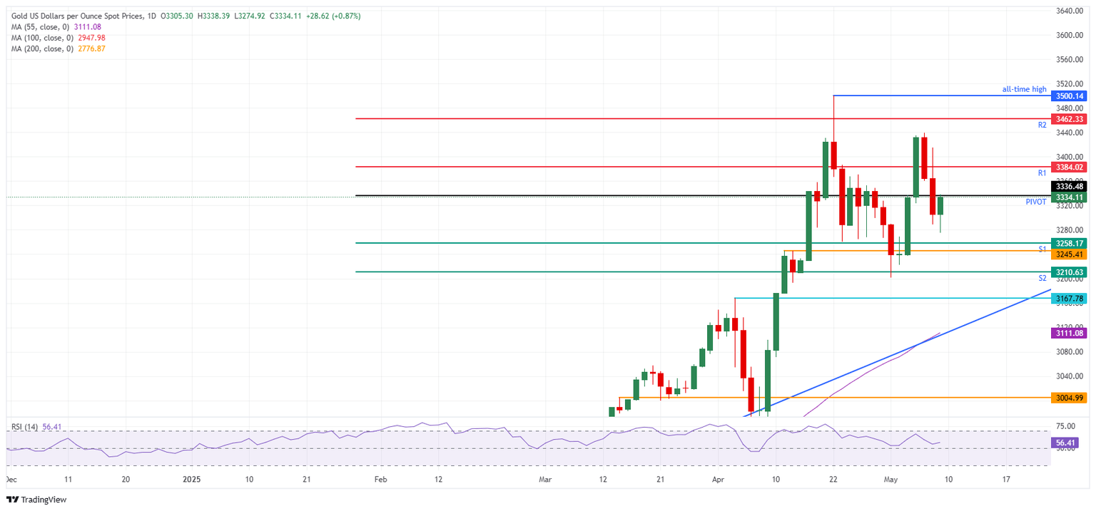 Gold (XAU/USD) edges up near 1.0% on Friday and heads back above $3,335 at the time of writing. The additional leg higher comes after United States (US) President Donald Trump called upon China to open its markets for the US, adding that an 80% tariff on Chinese goods 'seems right', Trump added. The precious metal’s price already edging higher in early trading as markets call the trade deal announced on Thursday between the United States (US) and the United Kingdom (UK) an 'empty shell’. The US-UK trade deal gives the US better market access and a faster customs process for exports to Britain, but falls short of a "full and comprehensive" agreement.