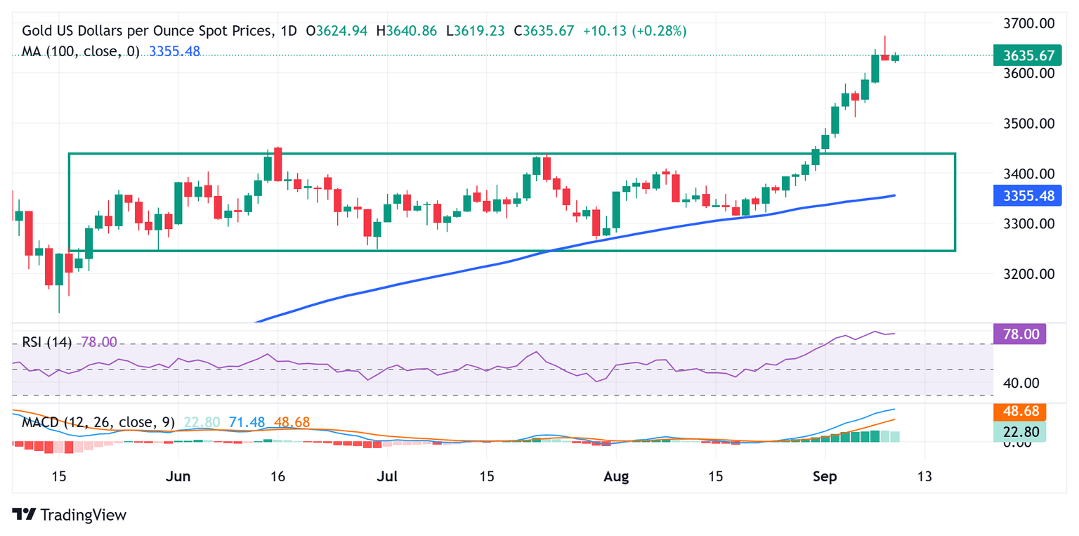 On the flip side, the $3,640-3,645 zone could act as an immediate hurdle ahead of the all-time peak, around the $3,675 area touched the previous day. Some follow-through buying could allow the Gold price to build on the recent breakout momentum and aim towards conquering the $3,700 round figure. The broader technical setup, however, suggests that bulls might refrain from placing aggressive bets, suggesting that the said handle could act as a strong near-term barrier for the XAU/USD pair.