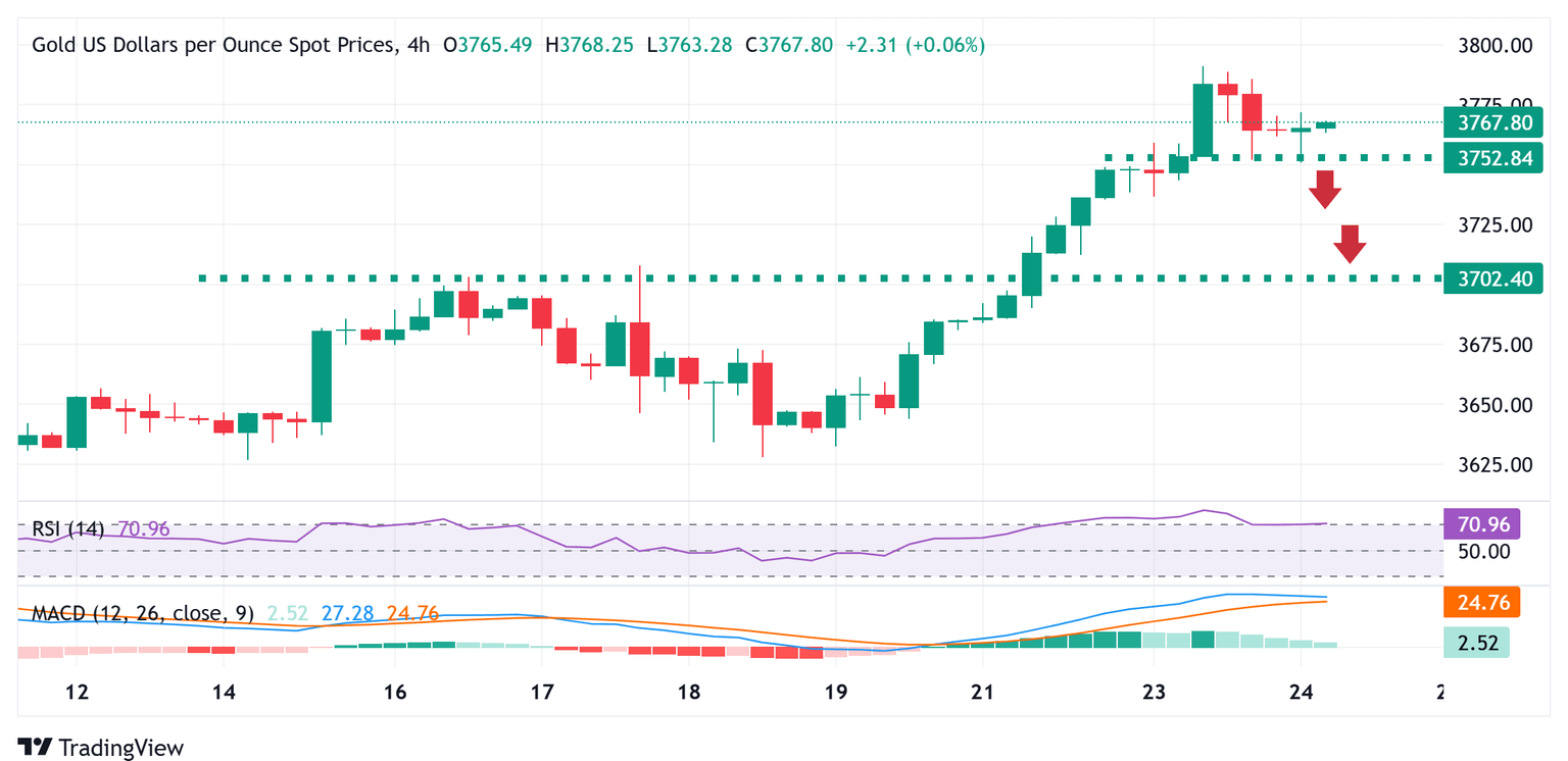 The recent blowout rally has defied overbought conditions, and the emergence of some dip-buying on Wednesday suggests that the path of least resistance for the Gold price remains to the upside. However, the overnight failure ahead of the $3,800 mark could be seen as the first sign of a possible bullish exhaustion. Hence, some follow-through selling below the Asian session low, around the $3,750 area, could expose the $3,710-$3,700 support zone.