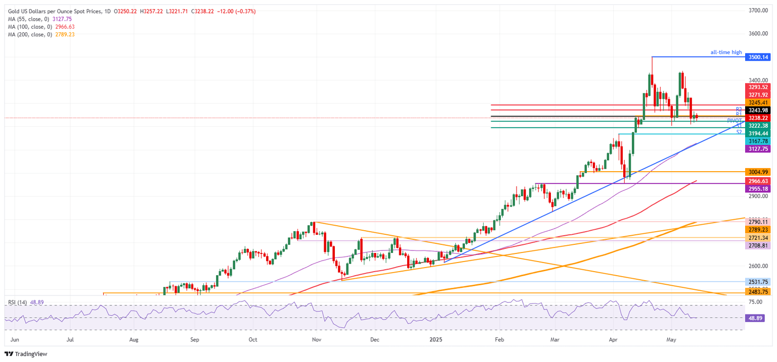 Gold (XAU/USD) dips back to $3,235 on Wednesday while the worst of the selling pressure seems to be over due to a softer US Dollar (USD). The softer-than-expected inflation reading for April released on Tuesday, gave markets a push to head into Risk On assets, with the widely-feared inflation shock from tariffs not materializing yet. The softer-than-expected reading for both the monthly Headline and core components boosted a relief rally in equities and led investors to price in more Federal Reserve (Fed) rate cuts for this year.