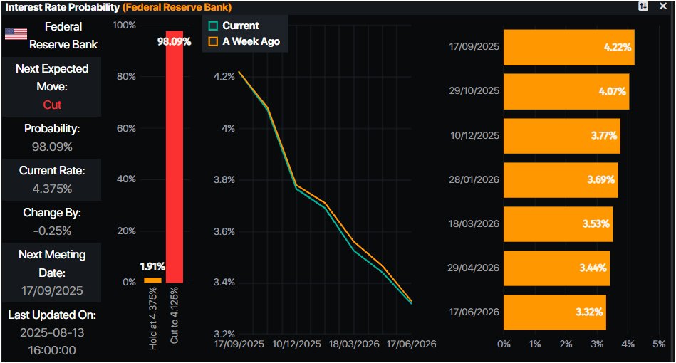 - Fed Interest Rate Probabilities show that traders had priced in a 98% chance of a quarter of a percentage rate cut at the September meeting, according to Prime Market Terminal data.