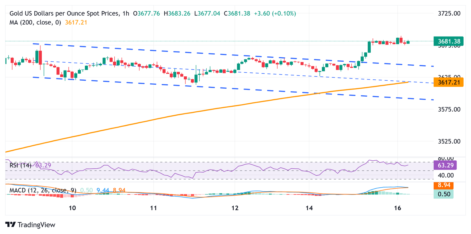 Gold (XAU/USD) sticks to modest intraday gains near the all-time peak touched earlier this Tuesday, though it remains below the $3,700 mark through the first half of the European session. The growing conviction that the US Federal Reserve (Fed) will lower borrowing costs this week drags the US Dollar (USD) to its lowest level since July 7 and continues to benefit the non-yielding yellow metal. Apart from this, geopolitical risks stemming from the intensifying Russia-Ukraine war turn out to be another factor driving flows towards the safe-haven commodity.