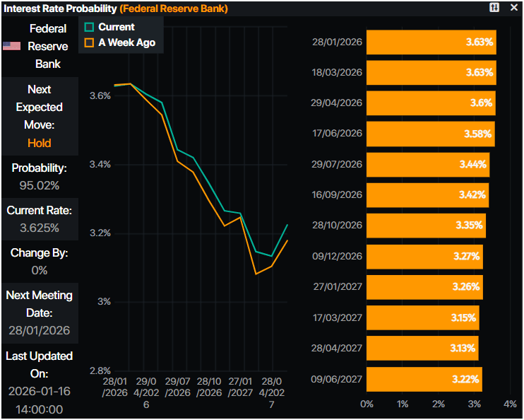 - Given the backdrop, traders trimmed the chances for further easing by the Federal Reserve. Prime Market Terminal data shows 43 basis points of easing expected towards the end of 2026.