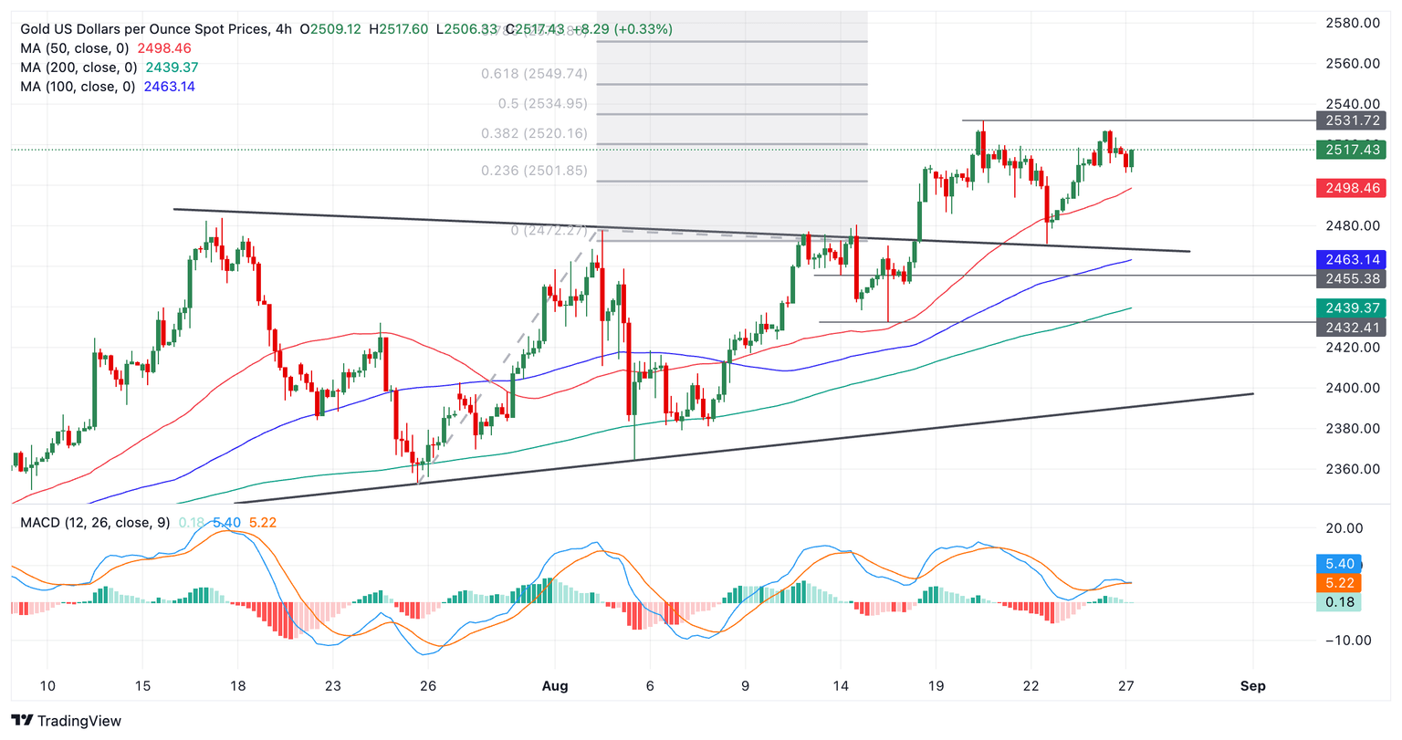 A break above the $2,531 all-time high from August 20 would provide added confirmation of a continuation higher towards the $2,550 target.
