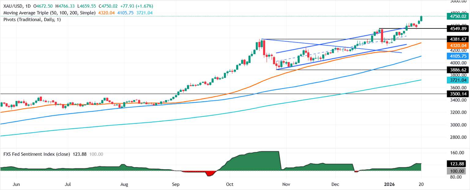 Gold (XAU/USD) price rallies past $4,750 to a new record high near $4,766 on Tuesday amid escalating geopolitical tensions, including the trade war between the US and the European Union, along with the sudden jump of global bond yields, following a “tepid 20-year debt auction earlier in the day,” according to Bloomberg. At the time of writing, XAU/USD trades at $4,758, up by more than 3.50% on the day.