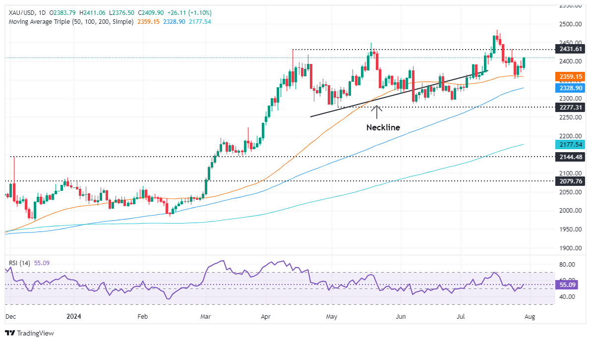 If XAU/USD buyers reclaim the psychological $2,450 area, that could sponsor a leg up to challenge the all-time high at around $2,483, followed by the $2,500 mark.