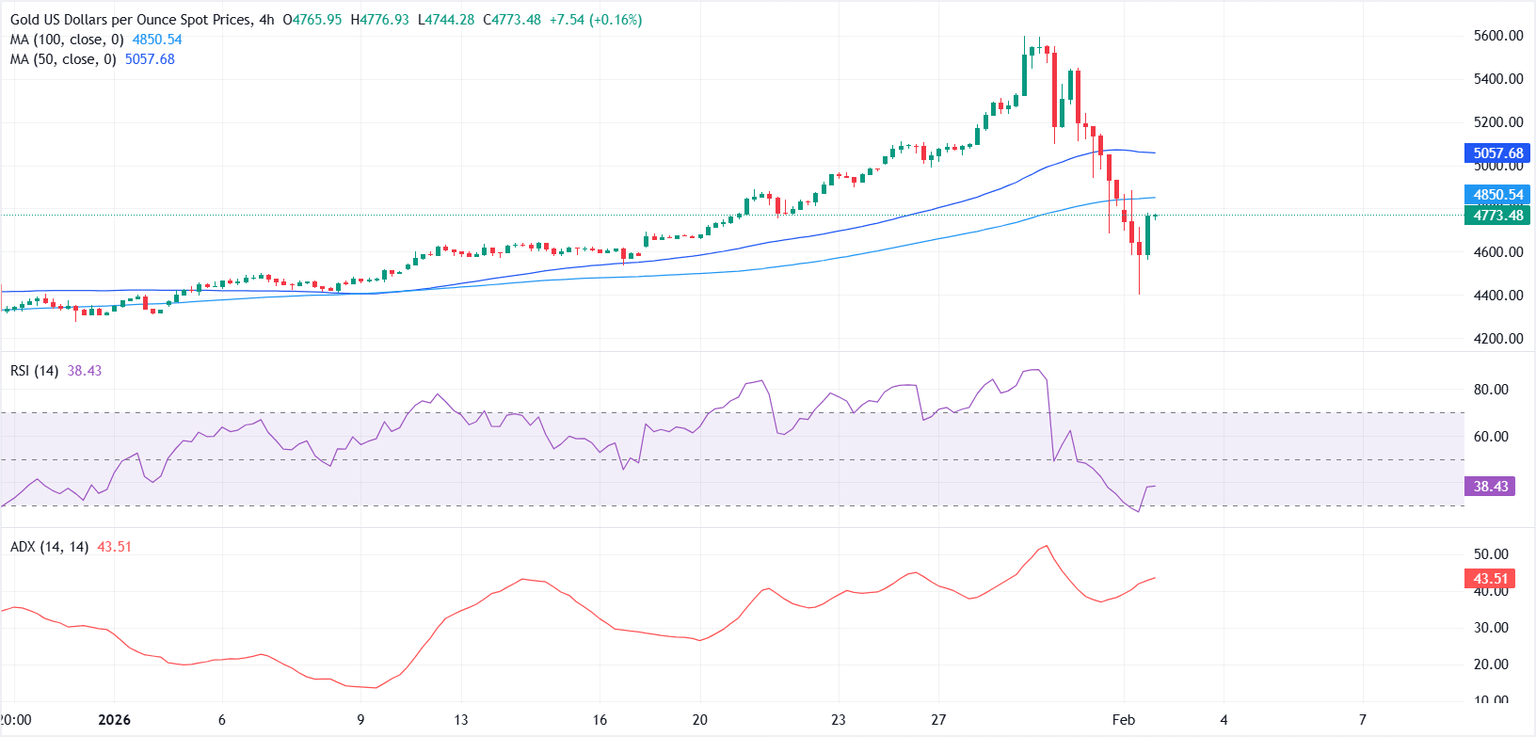 Gold (XAU/USD) stabilises on Monday with dip-buying interest emerging after a sharp correction from last week’s surge to fresh all-time highs near $5,600. At the time of writing, XAU/USD trades around $4,770, recovering after an intraday slide of nearly 10% to over three-week lows near $4,402.
