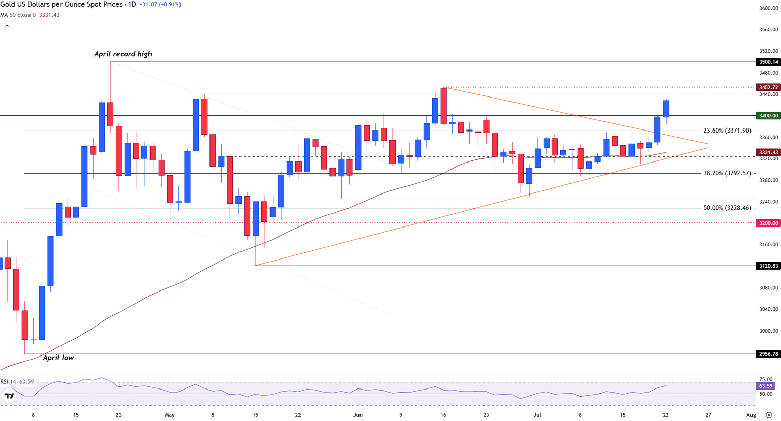 Gold (XAU/USD) has broken out above the $3,400 resistance level, confirming a move beyond the symmetrical triangle pattern that had been forming over recent weeks.