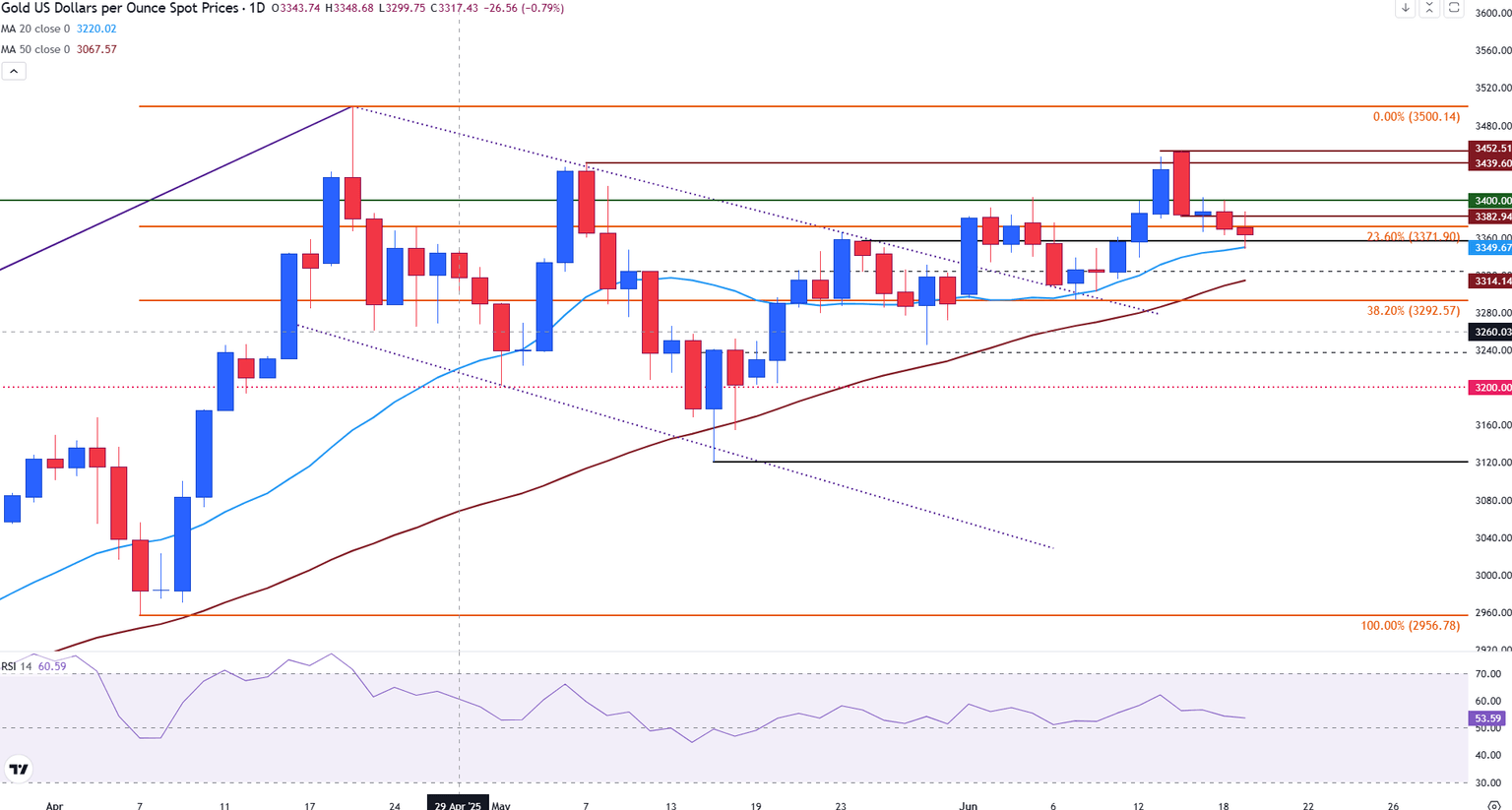 At the time of writing, prices are currently trading around $3,365, with immediate resistance located at the 23.6% Fibonacci retracement of the April move, at $3,371. This level lies just above the 20-day Simple Moving Average (SMA) at $3,350, reinforcing the short-term significance of this zone.