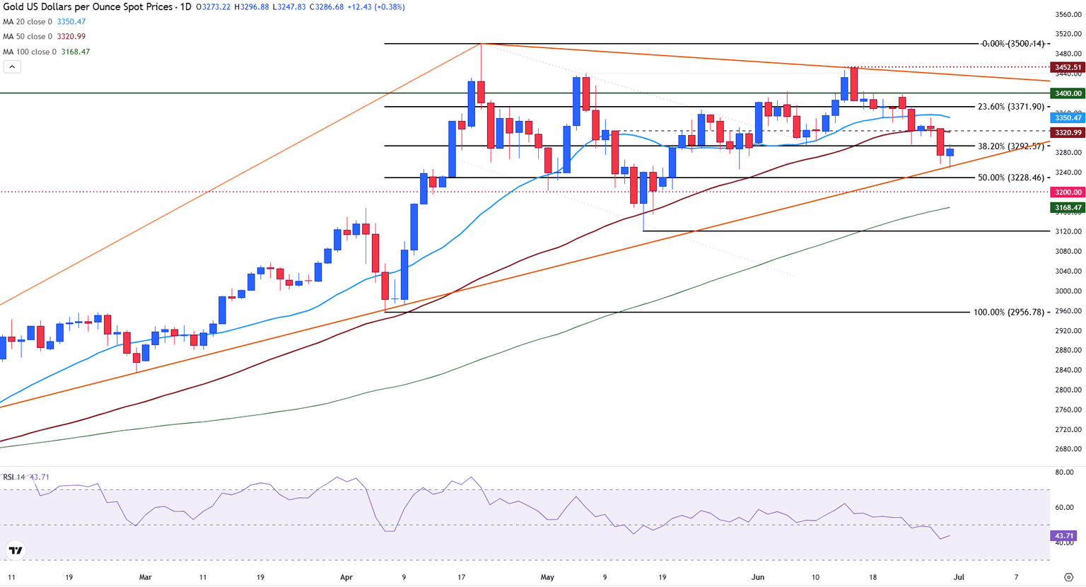 Gold is trading at $3,285 at the time of writing on Monday, confined between the 50% and the 38.2% Fibonacci retracement levels of the April low-high move at $3,228 and $3,292, respectively.