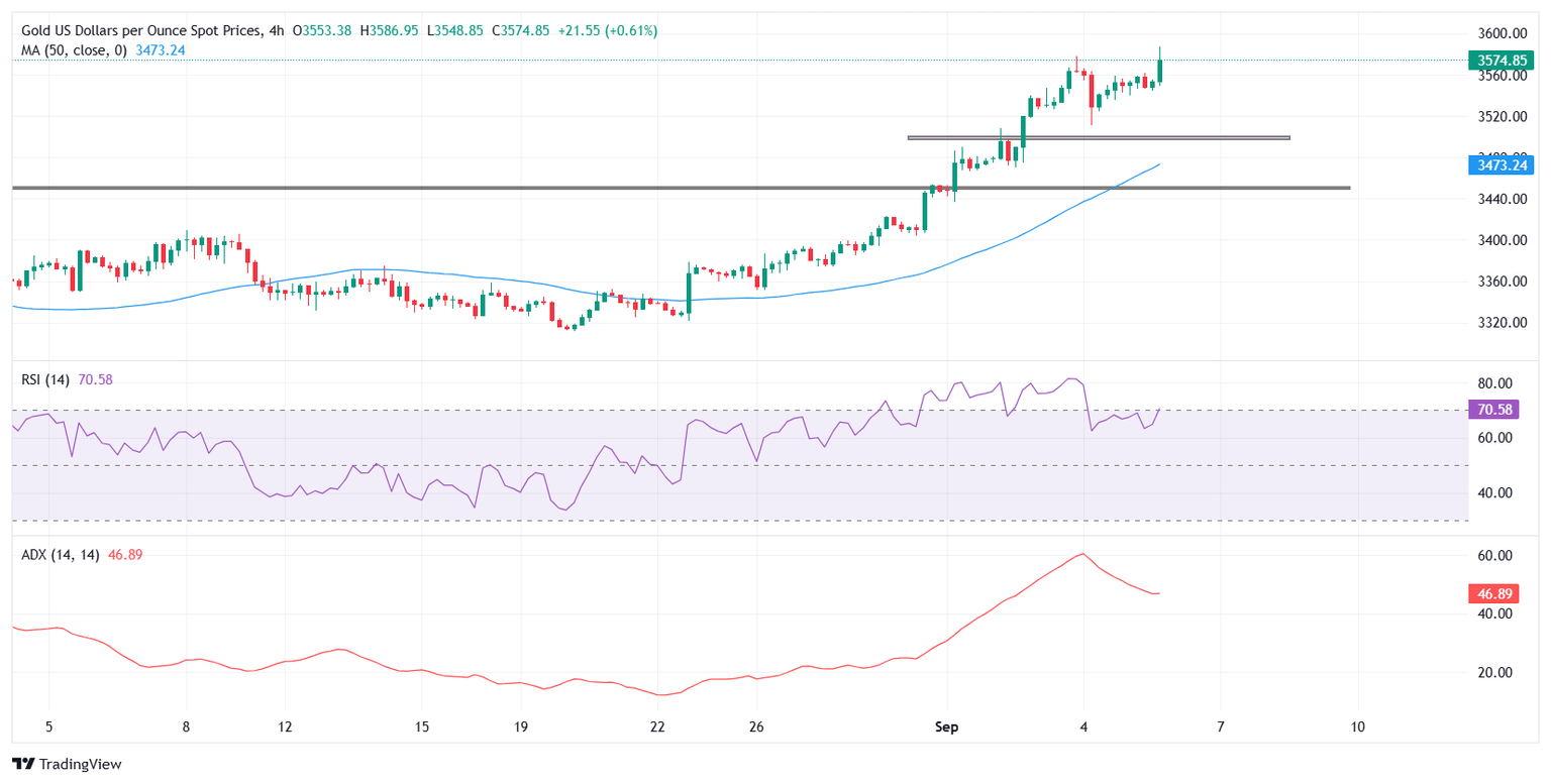 XAU/USD printed a fresh all-time high at $3,586 on Friday before easing slightly, and it is now consolidating just below record highs around $3,575. The price action suggests healthy digestion of gains, with the yellow metal holding comfortably above the 50-period Simple Moving Average (SMA) on the 4-hour chart at $3,473, which acts as a strong support base.