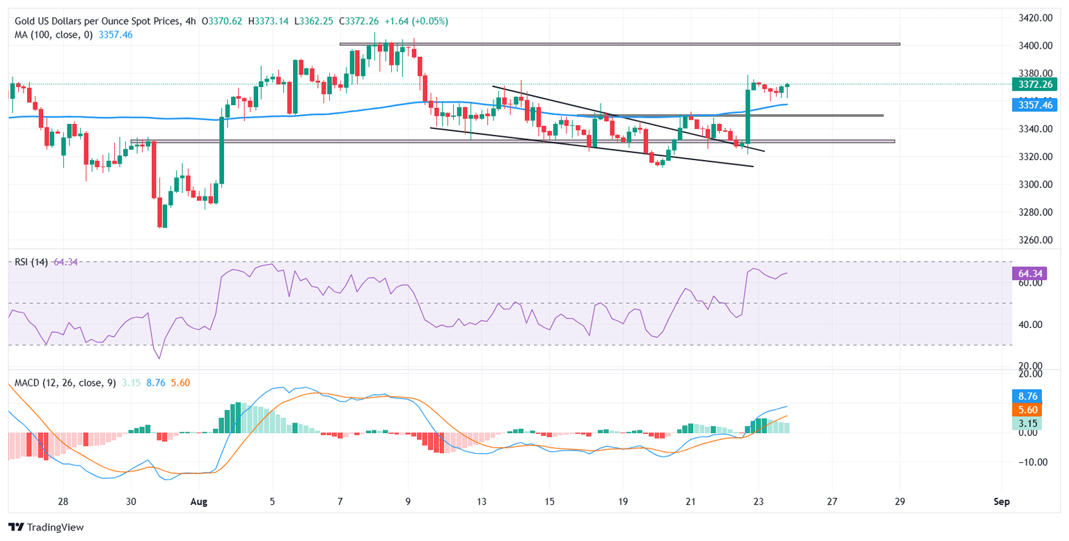 Gold (XAU/USD) kicks off the week on a softer footing after touching a two-week high on Friday, following Federal Reserve (Fed) Chair Jerome Powell’s dovish remarks at the Jackson Hole Symposium that fueled a broad rally in precious metals. At the time of writing, the metal is trimming earlier losses and edging higher during the American session, consolidating near recent peaks around $3,373.