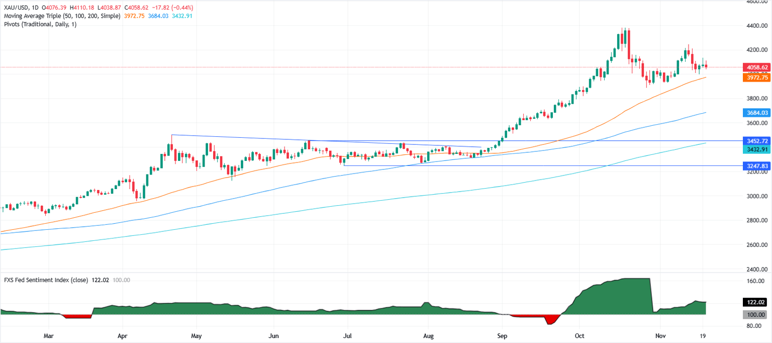 Gold’s uptrend remains intact even though Fed officials turned hawkish, and the chances for a cut are slim. However, price action suggests that sellers could be in control once XAU/USD drops below the November 18 swing low of $3,998, ahead of testing the 50-day Simple Moving Average (SMA) at $3,954.