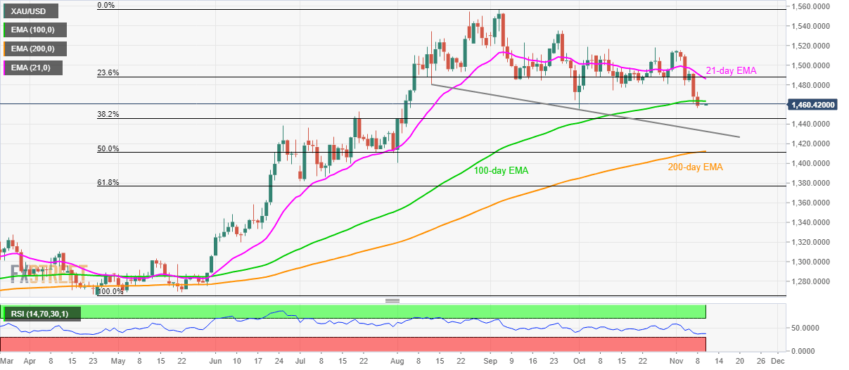 Although Gold prices stop further declines below October low, a sustained trading below 100-day EMA for the first time since late-May keep sellers hopeful as the metal trade around $1,460 during the Asian session on Monday.
