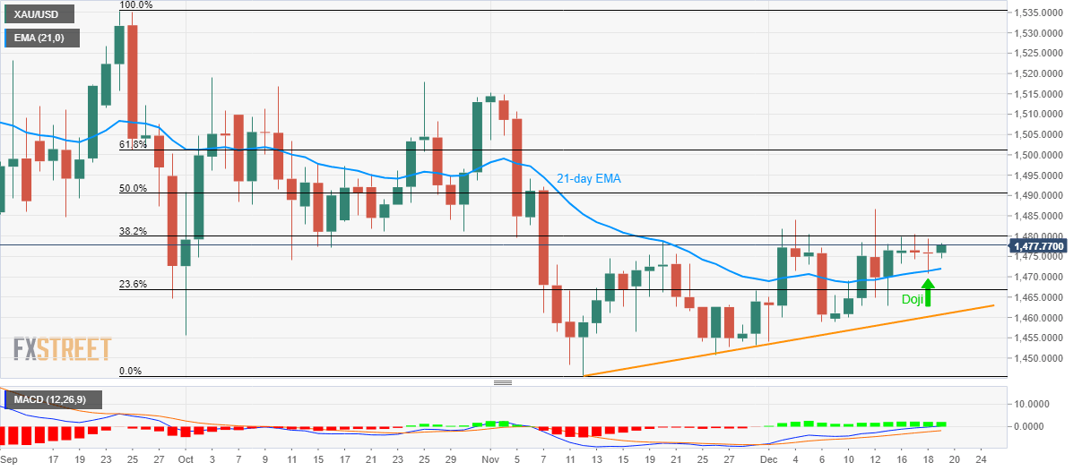 Gold prices pause the previous two-day declines while taking the bids to $1477.80 during early Thursday. The safe-haven metal trades successfully beyond 21-day Exponential Moving Average (EMA) wherein Wednesday’s bullish Doji formation on the daily chart indicates further recovery.