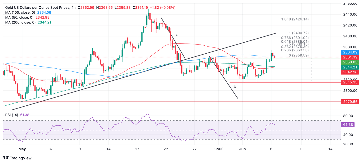 Gold (XAU/USD) is trading up by about 0.2% in the $2,360s on Thursday just after the European Central Bank (ECB) decides to cuts interest rates by 0.25% at its June policy meeting. The decision to lower interest rates is positive for Gold as it broadly reduces the opportunity cost of holding the non-yielding asset.
