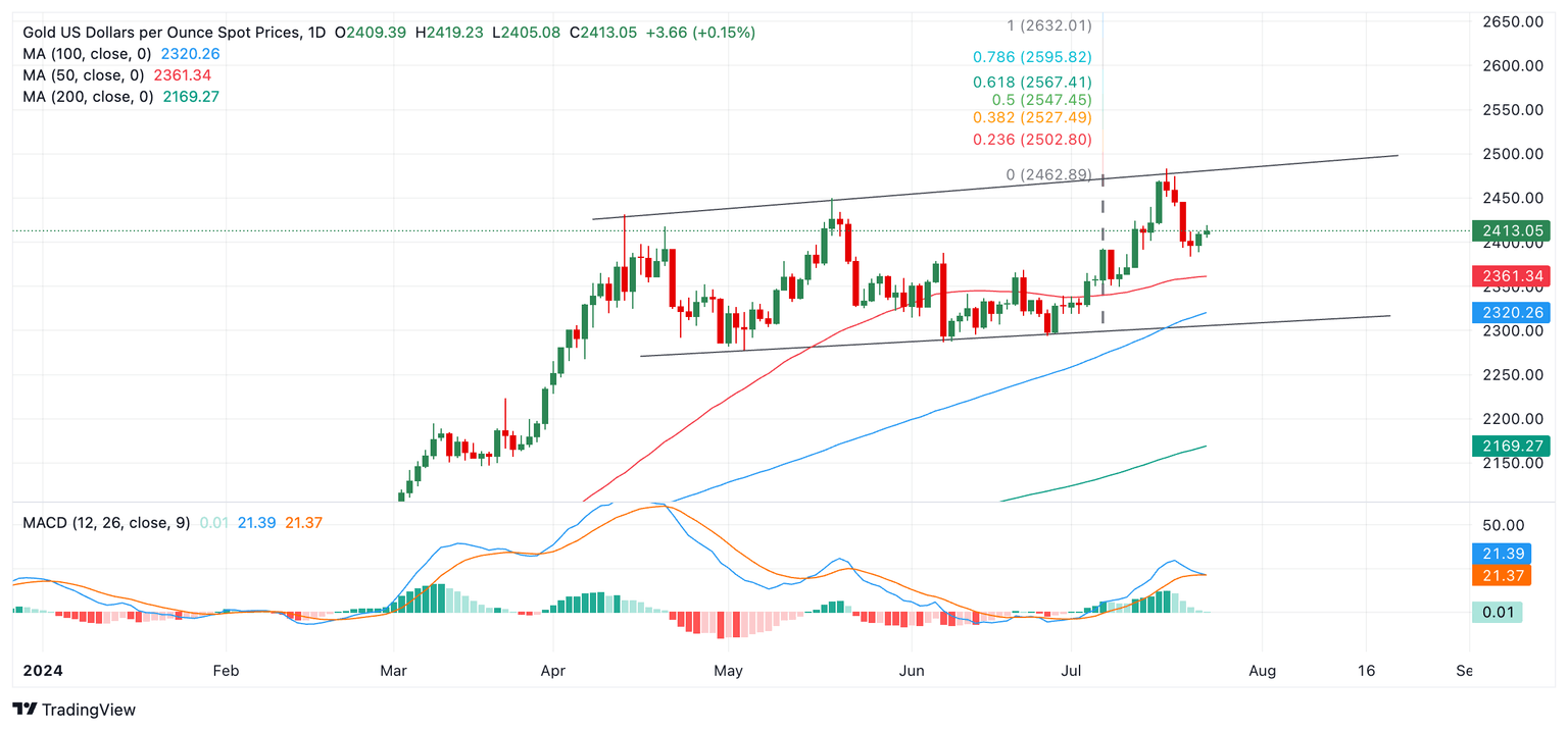 Gold (XAU/USD) recovers for a second day in a row, trading back up in the $2,410s as “stagflation” fears mount. The term, which describes above-trend inflation coupled with weak growth and jobs data, is a portmanteau of “stagnant” and “inflation”. Economists are applying it to the current environment following the release of the Philadelphia non-manufacturing Business Outlook Survey, which combined a weak headline and a high prices paid component. At the same time, US Existing Home Sales fell 5.4% month-over-month in June – further evidence of a slowdown – according to analysts at Rabobank.