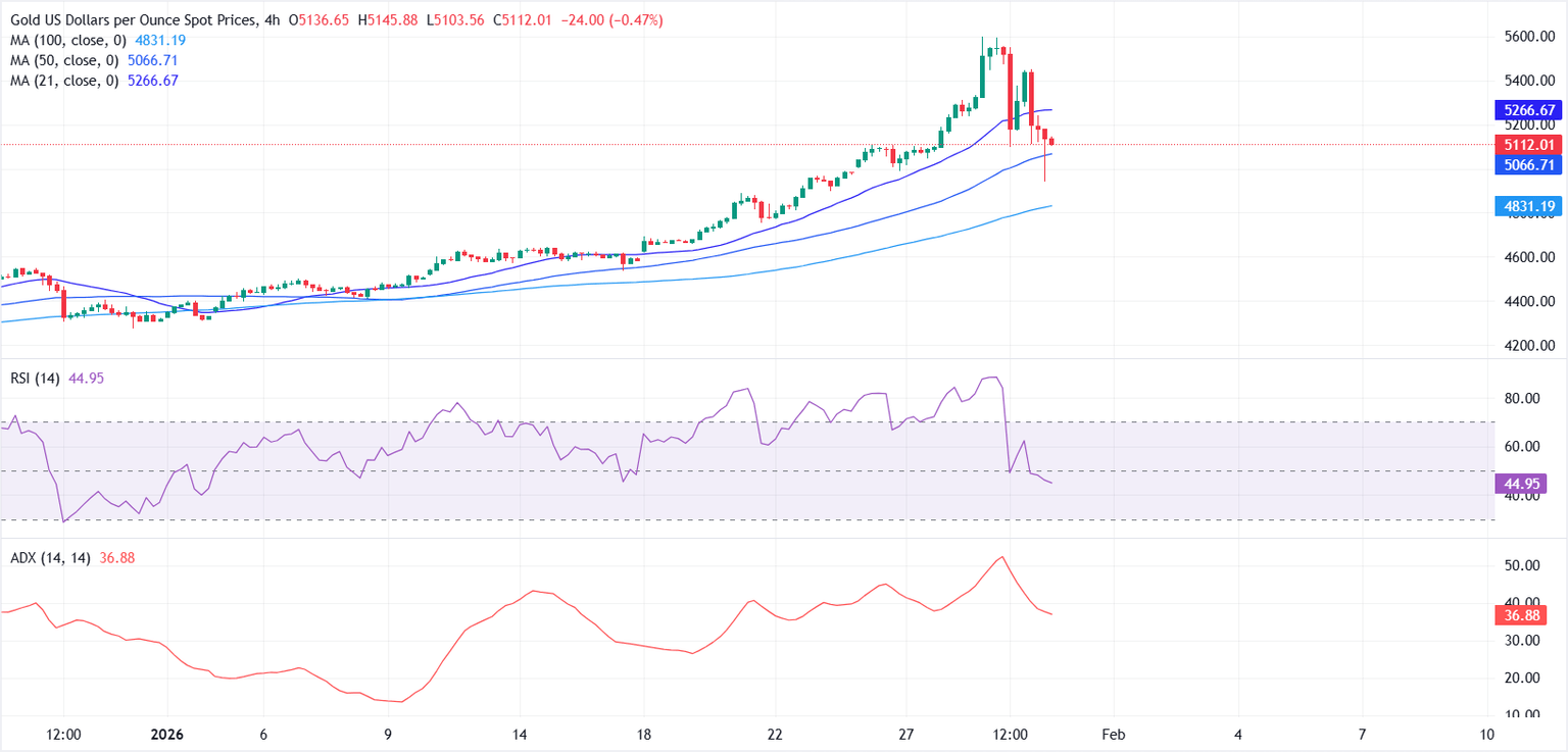 Gold (XAU/USD) comes under intense selling pressure on Friday, giving back most of the gains registered earlier this week as extreme volatility triggers broad-based liquidation of leveraged positions. Meanwhile, traders also lock in profits at elevated price levels. At the time of writing, XAU/USD is trading around $5,115, after posting a fresh all-time high near $5,600 on Thursday.