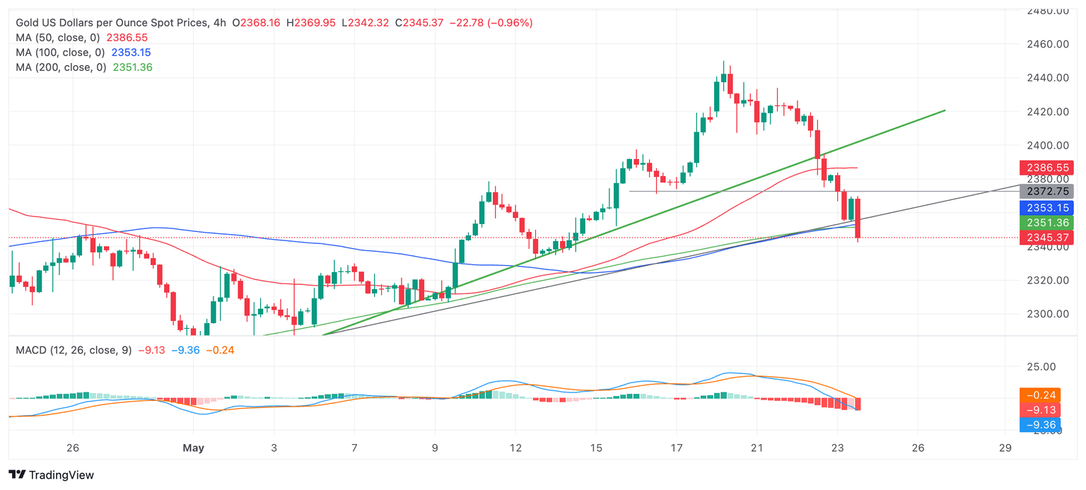 Gold (XAU/USD) has fallen to the $2,340s on Thursday after the release of US S&P Global Purchasing Manager Index survey data showed a greater-than-expected expansion in both the Services and Manufacturing sectors in May. The data suggests interest rates will have to remain restrictively high in the US for some time before inflation can be brought sustainably down to the Federal Reserve's 2.0% target.