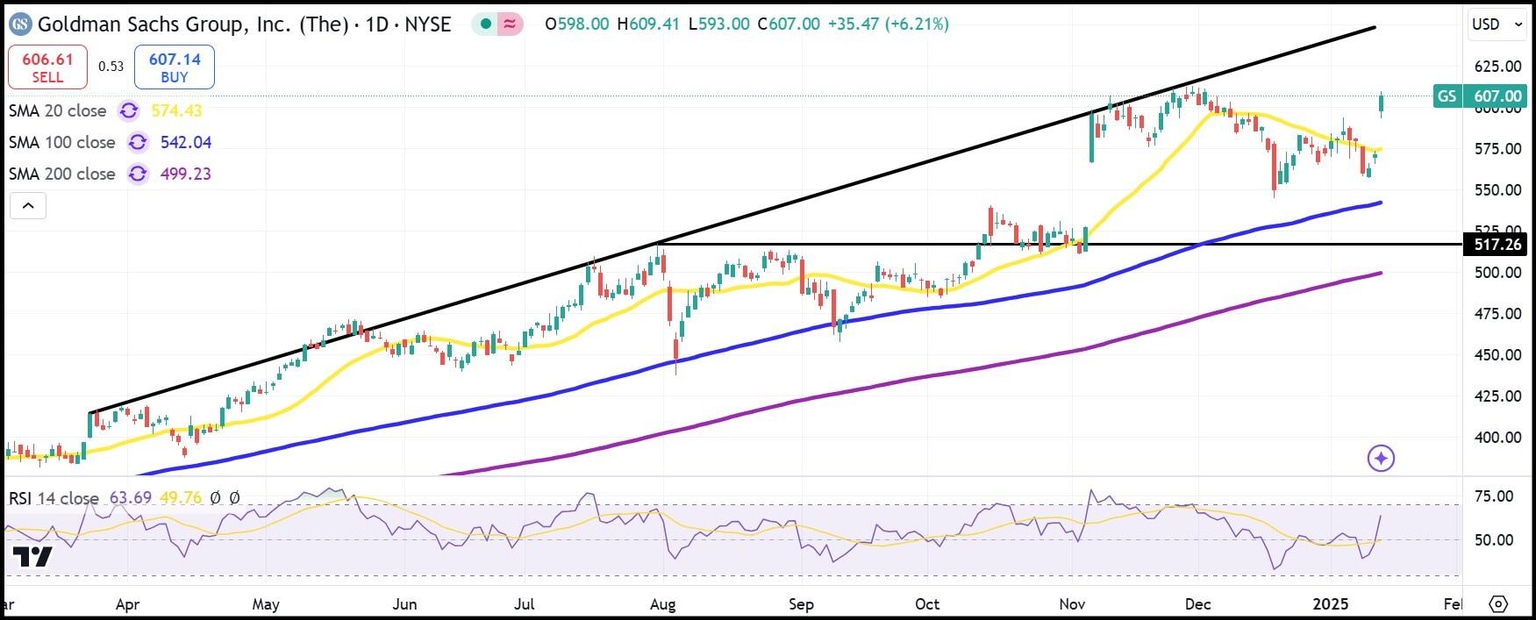 Goldman shares have rallied above the recent resistance near $593, and $600 seems like support for now. The top trendline that has worked since March 2024 leads us to expect GS stock to run up to $645 before growing heavy.