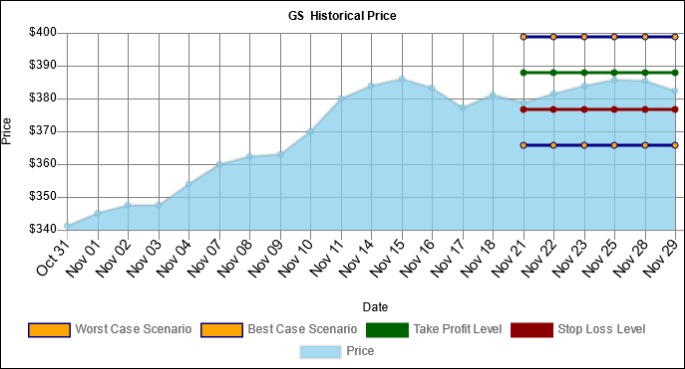 Within 1 week, our worst case scenario where we are 95% certain that this level won't trade for GS, is $ 365.7994, and the best case scenario overnight is $ 398.9206. levels outside of this range are unlikely, but still possible, to trade. We are 50% confident that $ 376.7621 could trade and that $ 387.9577 could trade. These levels are within statistical probability.