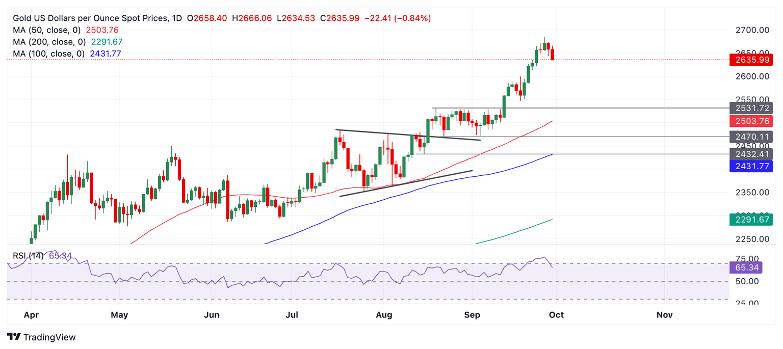 Given the precious metal’s entrenched uptrend, however, there is a good chance any correction will run out of steam and bulls will resume pushing the price higher. If Gold breaks to higher highs, it will further reconfirm the metal’s uptrending bias. The next targets to the upside are the round numbers $2,700 and then $2,750.