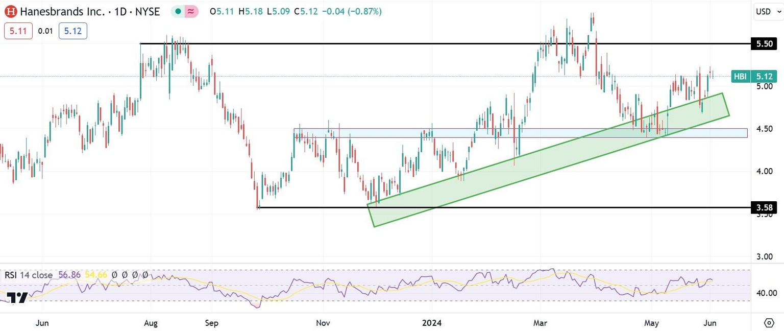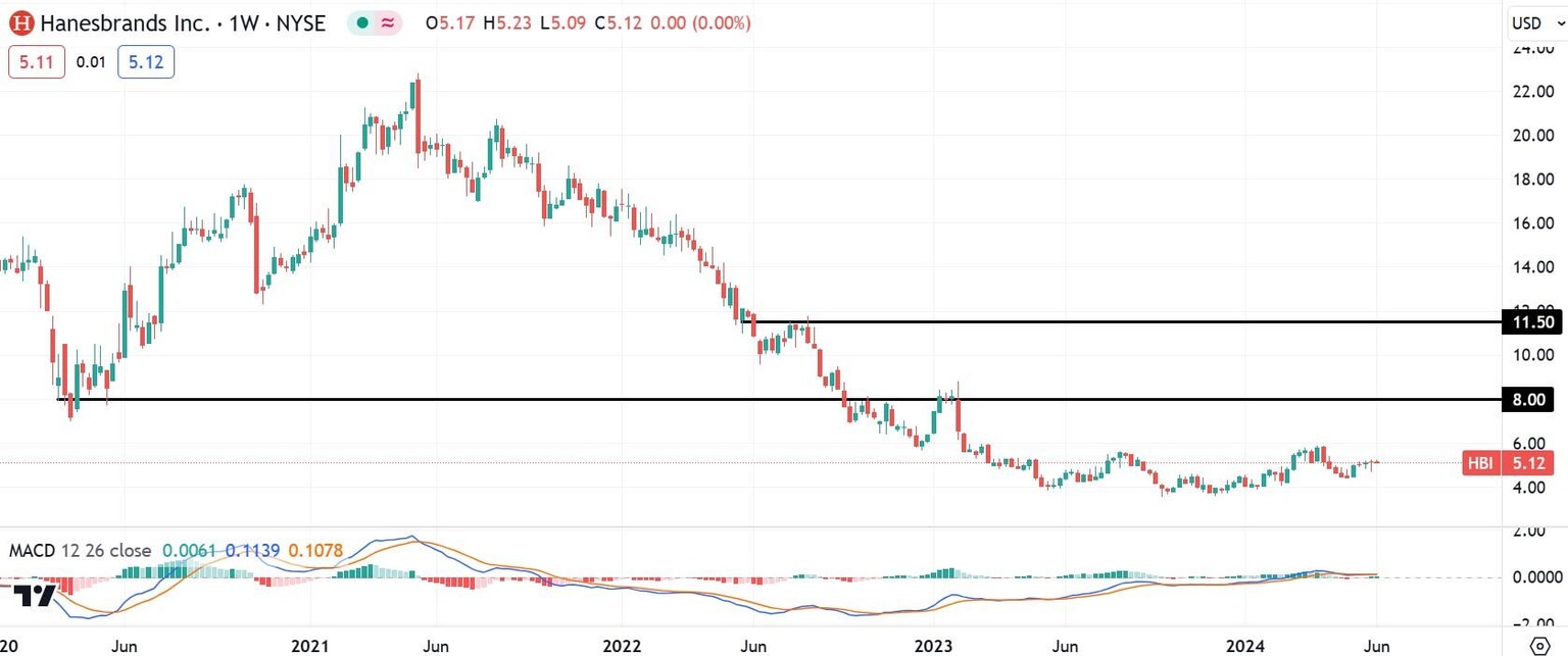 The long-term trend for Hanesbrands stock has been downward for quite some time. Since mid-2023 though, HBI stock has been consolidating and moving sideways in the $4.00 to $5.00 range. If the present rising share price can continue making gains, the $8.00 level from January 2023 and the $11.50 resistance level from summer 2022 both offer possible bull targets.
