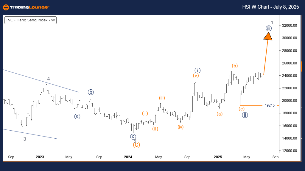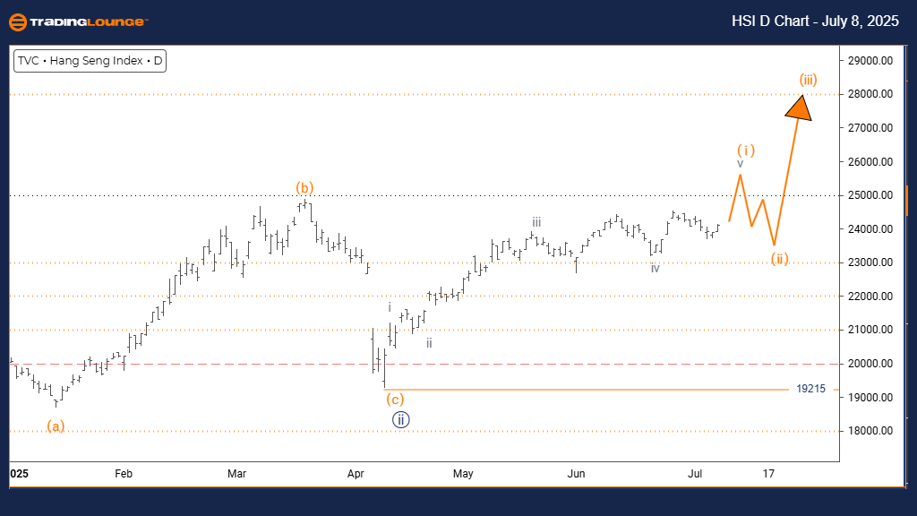 The daily chart of the Hang Seng Index indicates a bullish trend based on Elliott Wave theory. Price action currently reflects the impulsive formation of orange wave 1, within the broader navy blue wave 3. This setup points to the early phase of a potential strong uptrend.