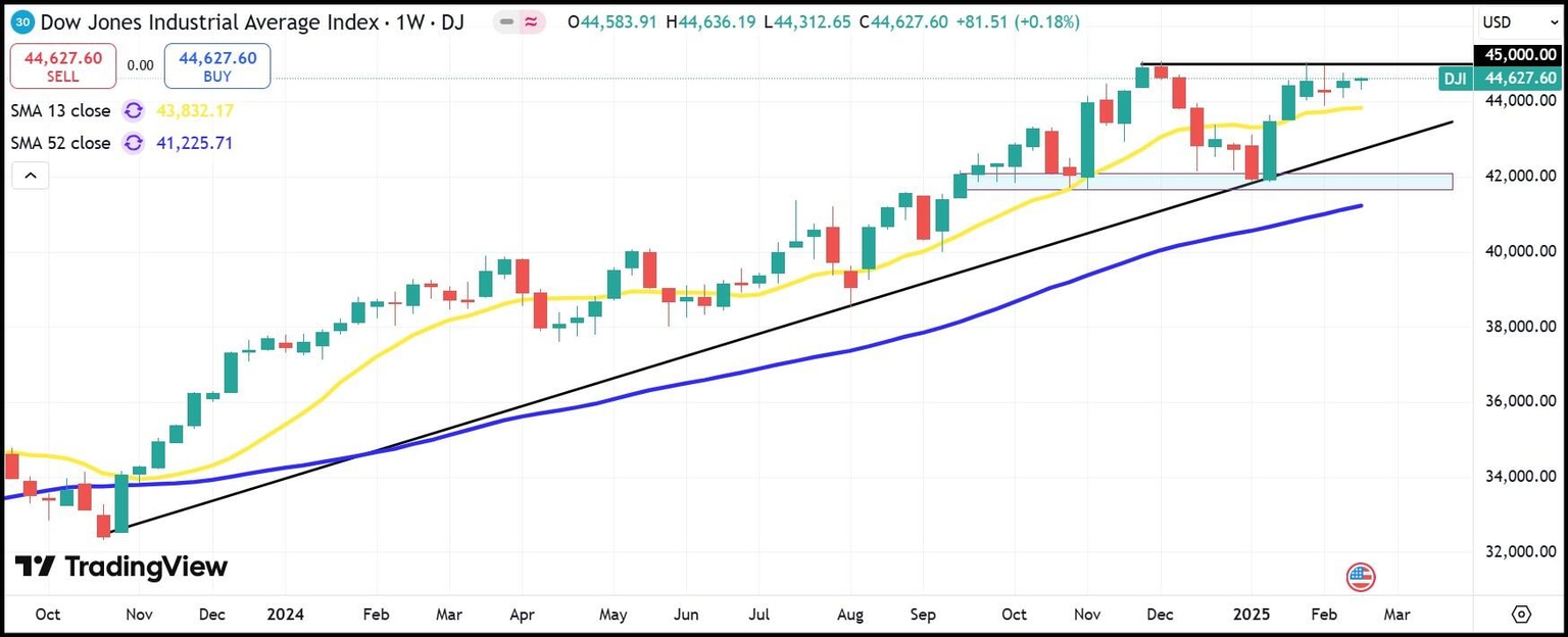 The technicals give us more reason for pessimism. The weekly chart of the DJIA shows the index petering out twice in a row in the region just above 45,000. In both cases — late November 2024 and then January 2025 — the index reached resistance between 45,050 and 45,070.