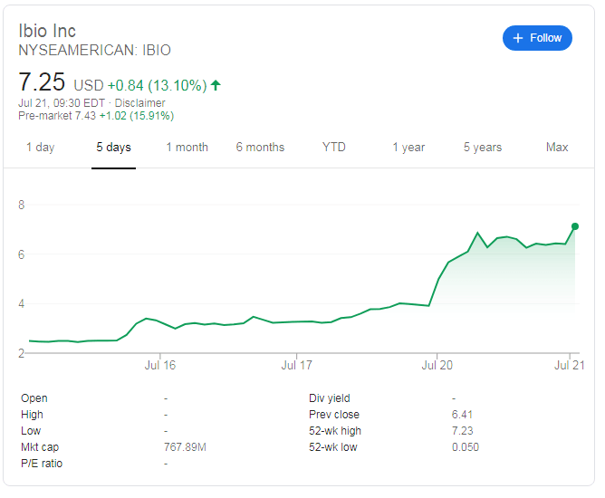 - NYSEAMERICAN: IBIO is trading above $7.10, up around 200% within a week.