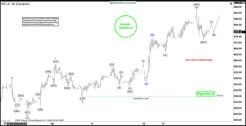 Short term Elliott Wave in Netflix (NFLX) shows incomplete bullish sequence from 4.22.2024 low favoring further upside. Rally from 4.22.2024 low is unfolding as an impulse Elliott Wave structure. Up from there, wave (1) ended at 664.25 and pullback in wave (2) ended at 626.44. The stock extended higher in wave (3) with internal subdivision as an impulse in lesser degree. Up from wave (2), wave ((i)) ended at 635.83 and wave ((ii)) pullback ended at 628.25. The stock extended higher in wave ((iii)) towards 651.25 and wave ((iv)) ended at 644.06. Wave ((v)) higher ended at 657.99 which completed wave 1 in higher degree.