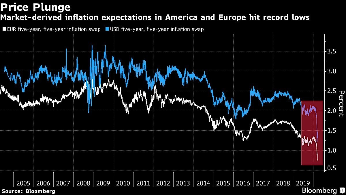 The market-based measures of inflation expectations in the US and Eurozone have declined to record lows amid the even increasing fears of a coronavirus-led recession in the global economy.