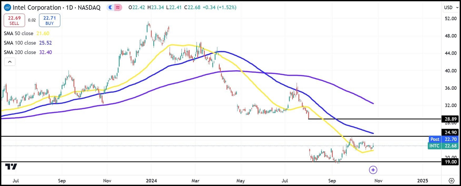 INTC stock has risen above the 50-day Simple Moving Average (SMA) over the past month, which is a good look for the struggling semiconductor. Now shares need to overtake resistance at $24.90. The 100-day SMA at $25.52 is just a big higher.