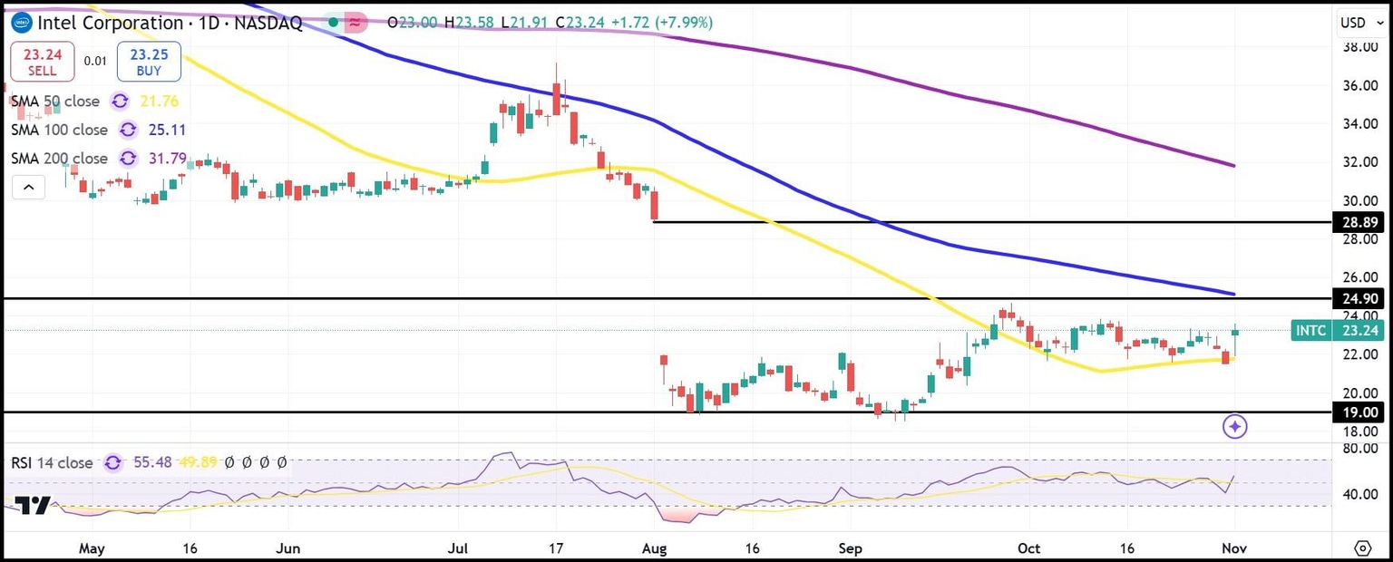 Intel stock still needs to overcome the $24.90 support turned resistance level, which we at FXStreet have been saying for months. One good sign is that the Relative Strength Index (RSI) is finally moving above the 50 neutral line, which means some momentum is emerging. But most of that is just based on earnings. The RSI had been at 41 on Thursday, but looks to close the week near 55.